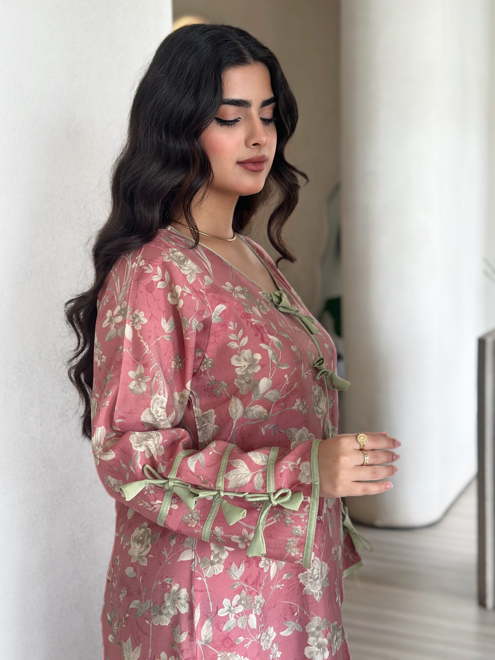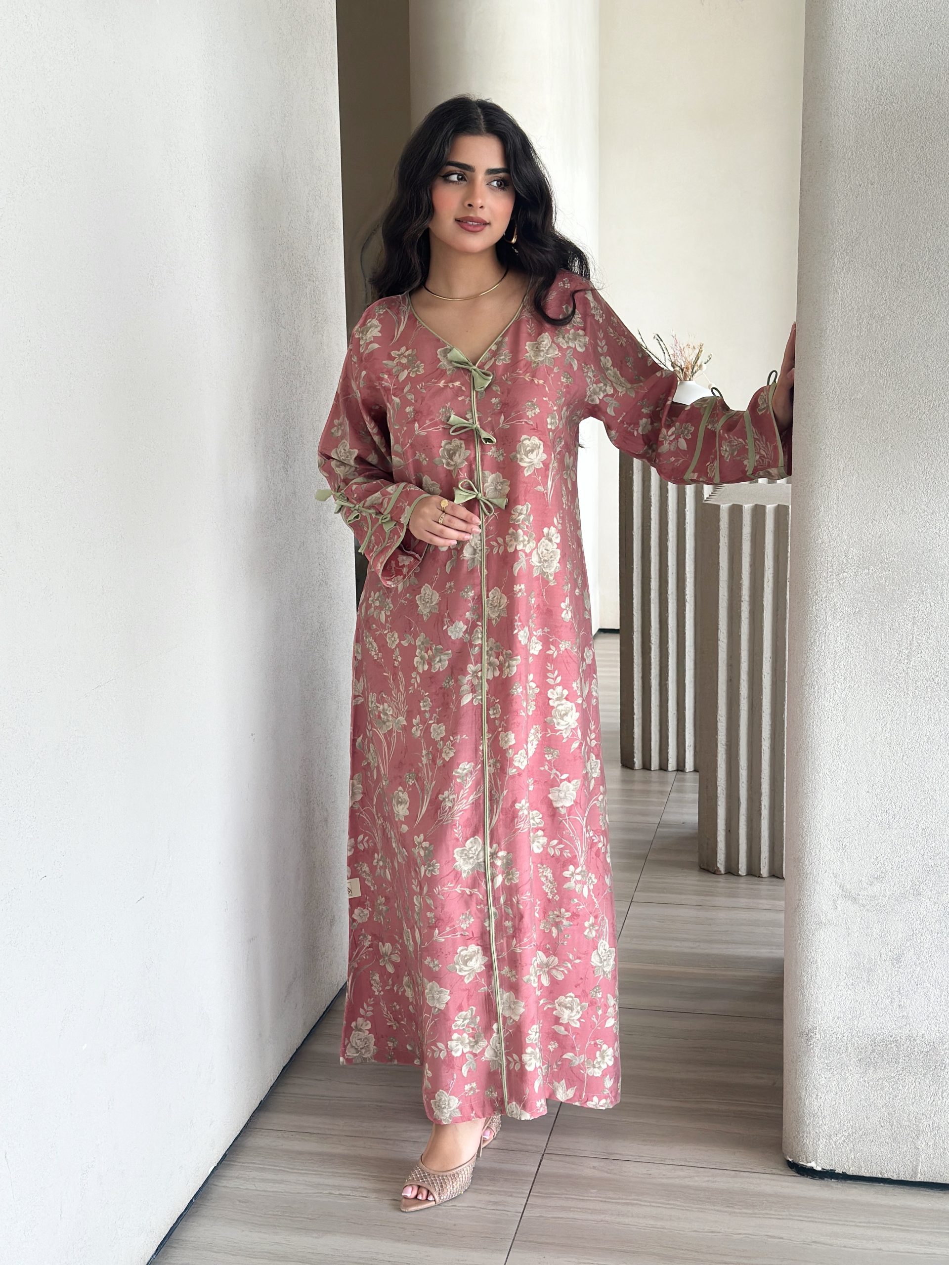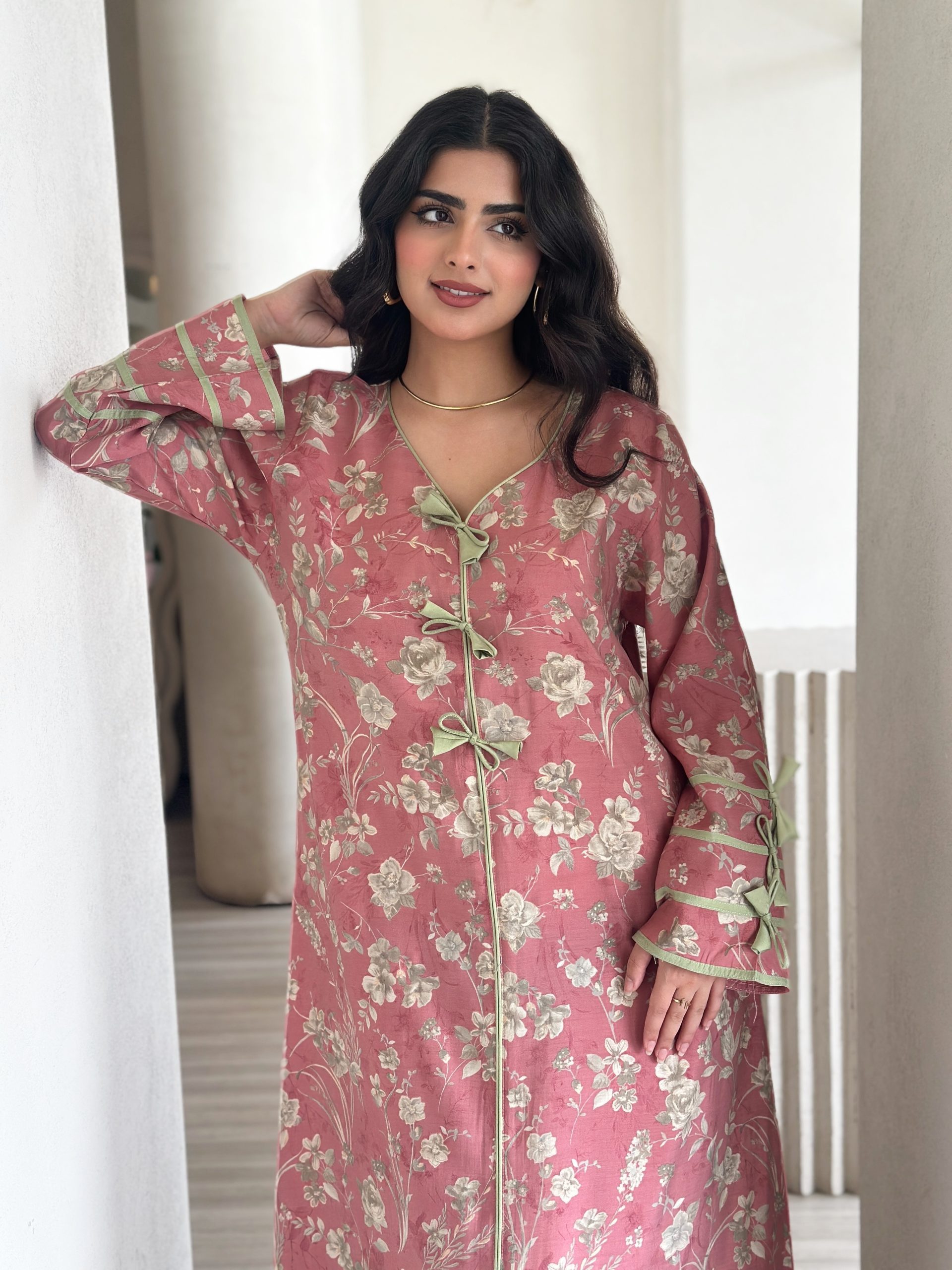 فستان عربي أنيق بتصميم طويل مزين بزهور ناعمة على خلفية وردية، مع أكمام واسعة تضيف لمسة من الأناقة التقليدية للمرأة العربية.